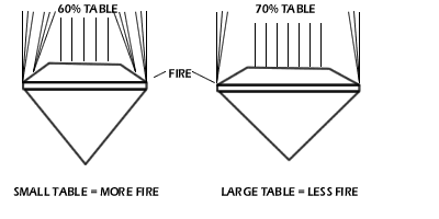 When compared to RD01, RD10 and RD13, all of the stones used in the study with larger table percentages (over 60%), had diminished fire as measured by the DCLR. It should also be pointed out that stones with crown angles of less than 33 degrees and those with crown angles of more than 36.5 degrees showed diminished fire (again, as measured by the DCLR) when compared to those that most closely resembled Tolkowsky's American Ideal Cut model. With regard to the pavilion angle, the study showed that stones with pavilion angles of 40.4-41.2 degrees are generally more optically efficient than those that fall outside of this range (as measured by the WLR and DCLR).